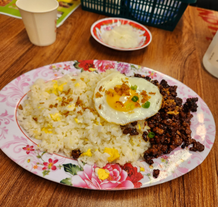 계란 볶음밥에 마늘 후레이크와 짭조름한 고기양념을 취향껏 비벼먹으면 됩니다.
